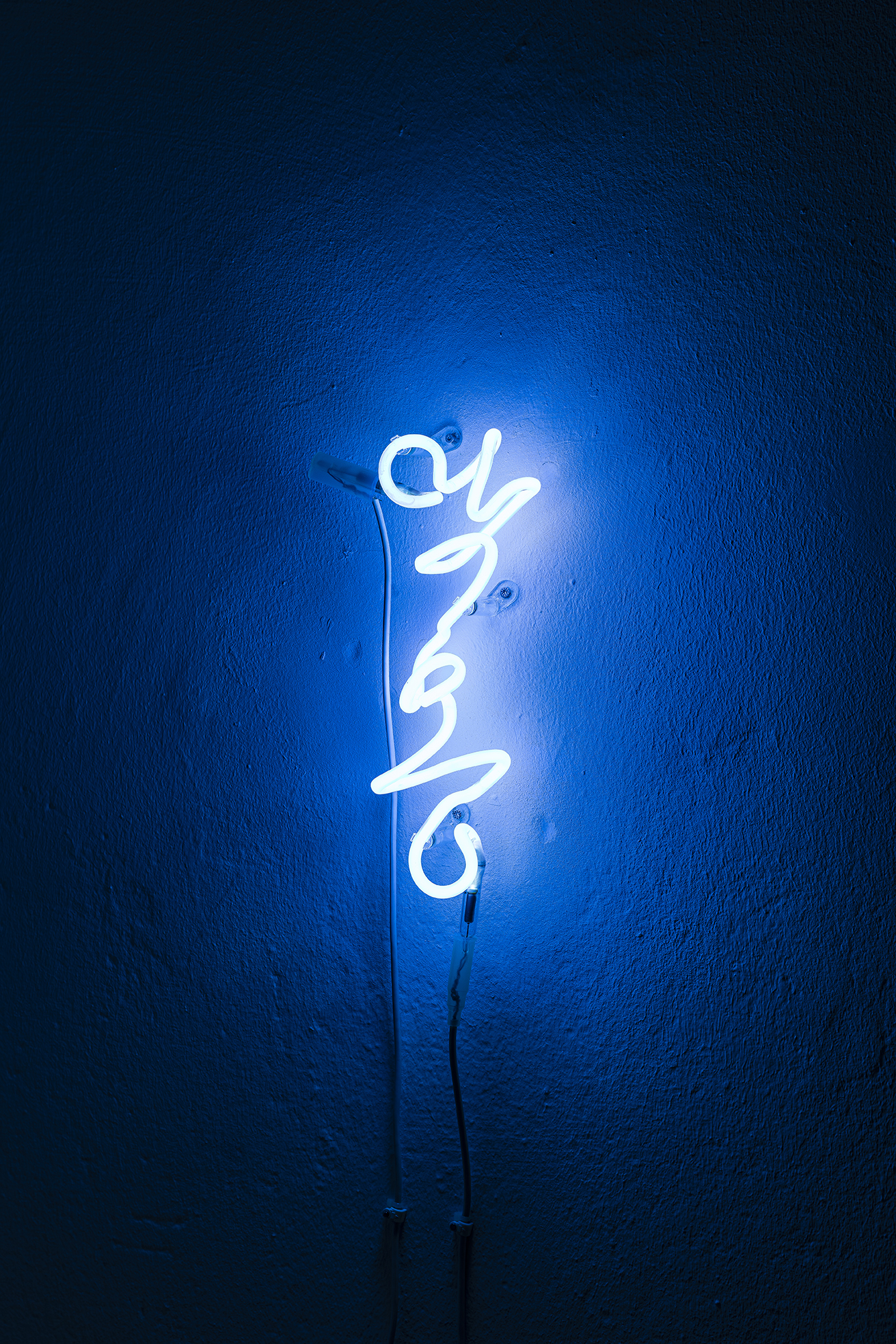 The neon work Nightmare (악몽, written vertically in Korean) recalls the glow of storefront signage from South Korea in the 1960s, when mass sex tourism emerged during rapid postwar development, capturing the transition from military violence to the violence of capital.