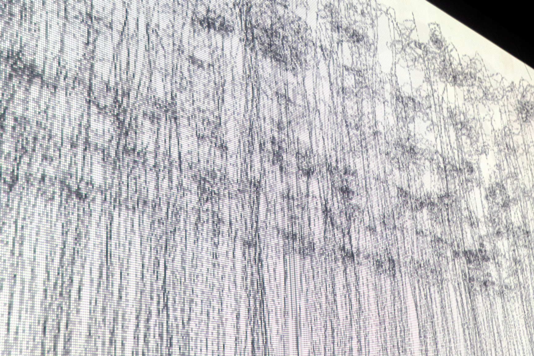 The 3D-game-object-rats were trained for 23 seconds to perform a specific task in a specific area by machine learning algorithm. As a result, most rats failed (did not perform) the task and fell out (escaped) from the 66 chambers. After a certain period of time, the rats were summoned back to the original area and the process was repeated for as long as the program ran. The black lines in the graphic were generated by the movement of the algorithm’s agent (rat) which indicates their behavioral pattens, and the omnipotent-perspective rotates around them.